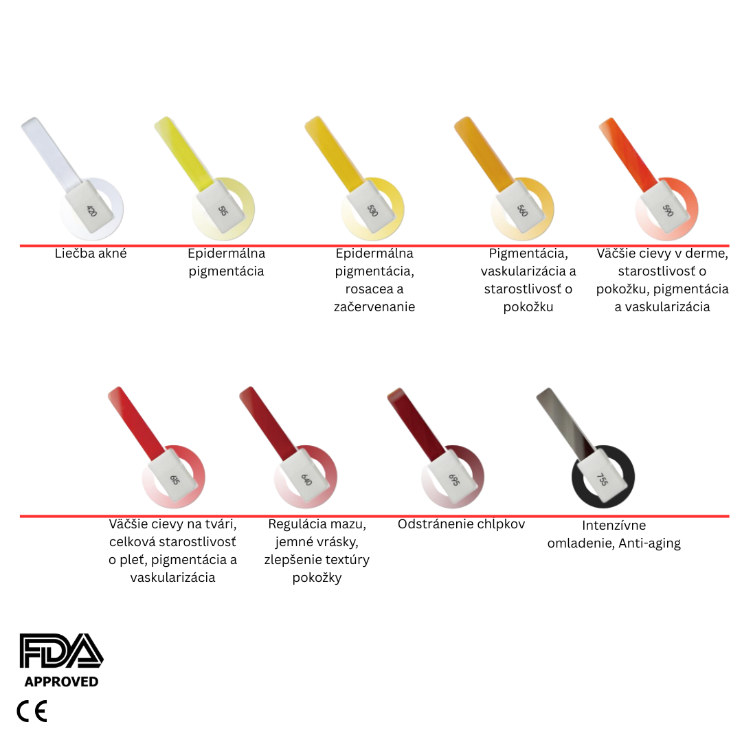- 560 nm – Pigmentové škvrny, vaskularizácia, starostlivosť o pleť