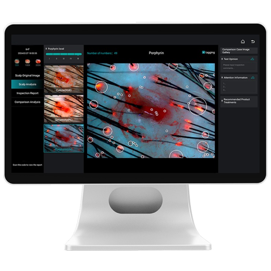 Analyzátor pokožky hlavy a vlasov využíva inteligentný systém s umelou inteligenciou, ktorý dokáže presne vyhodnotiť stav pokožky hlavy a vlasových folikulov na základe obrazovej analýzy. Vyšetrenie prebieha úplne neinvazívne, bez holenia, vytrhávania vlasov alebo akéhokoľvek zásahu do pokožky. Vďaka kvalitnej 16 Mpx HD optike, rôznym typom osvetlenia a zväčšeniu od 10× do 200× zariadenie poskytuje detailný a prehľadný obraz, ktorý pomáha odhaliť aj menej viditeľné problémy pokožky. Ergonomický dizajn zároveň zabezpečuje pohodlnú manipuláciu aj počas dlhších odborných konzultácií.